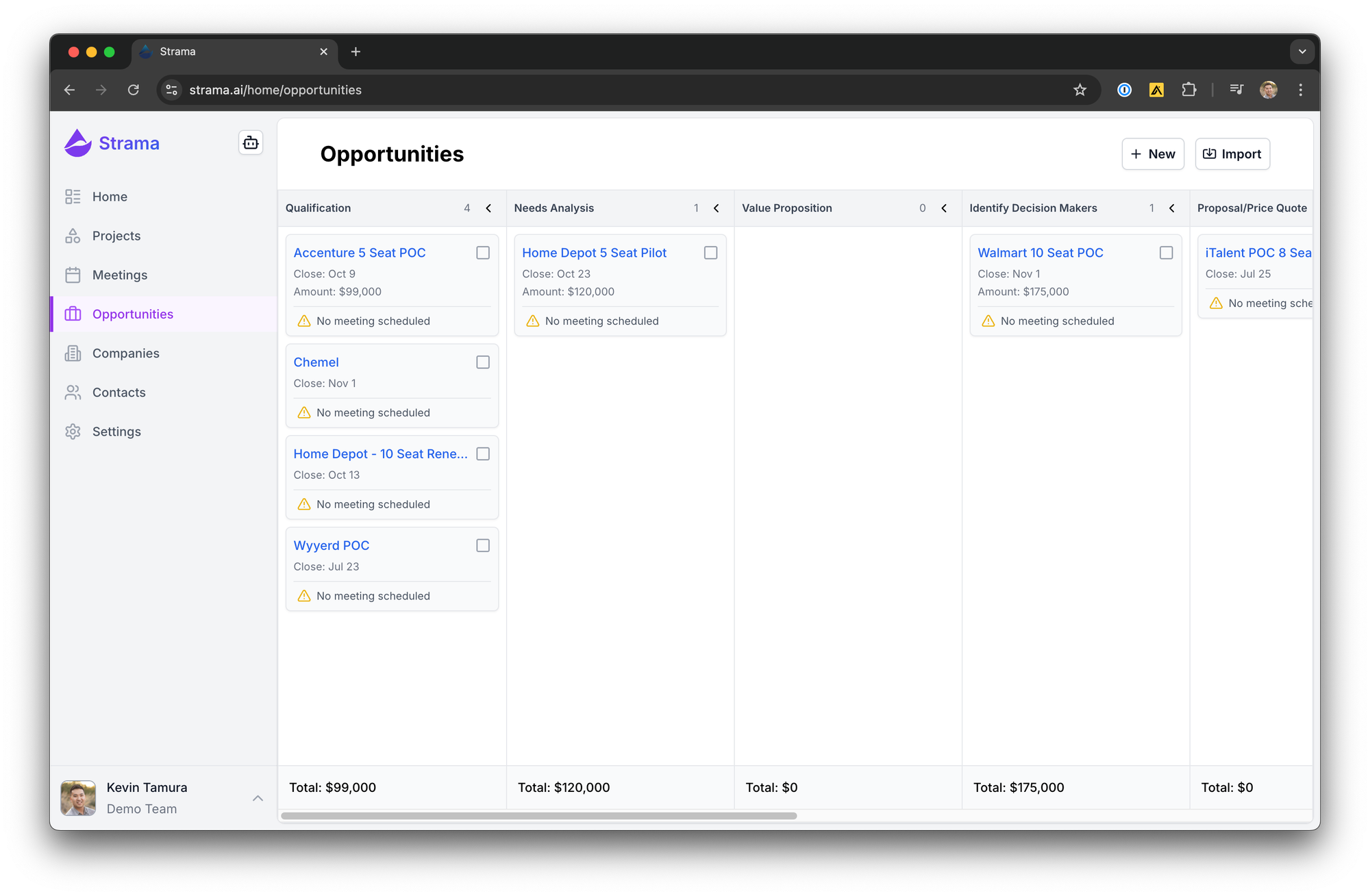 When you first log into Strama and navigate to the opportunities page, you're greeted with a clean, intuitive interface. This page seamlessly integrates with popular CRMs like Salesforce, HubSpot, NetSuite, and Zoho. This integration allows us to pull in the opportunities you're actively working on and enable you to make changes directly from the Strama window.