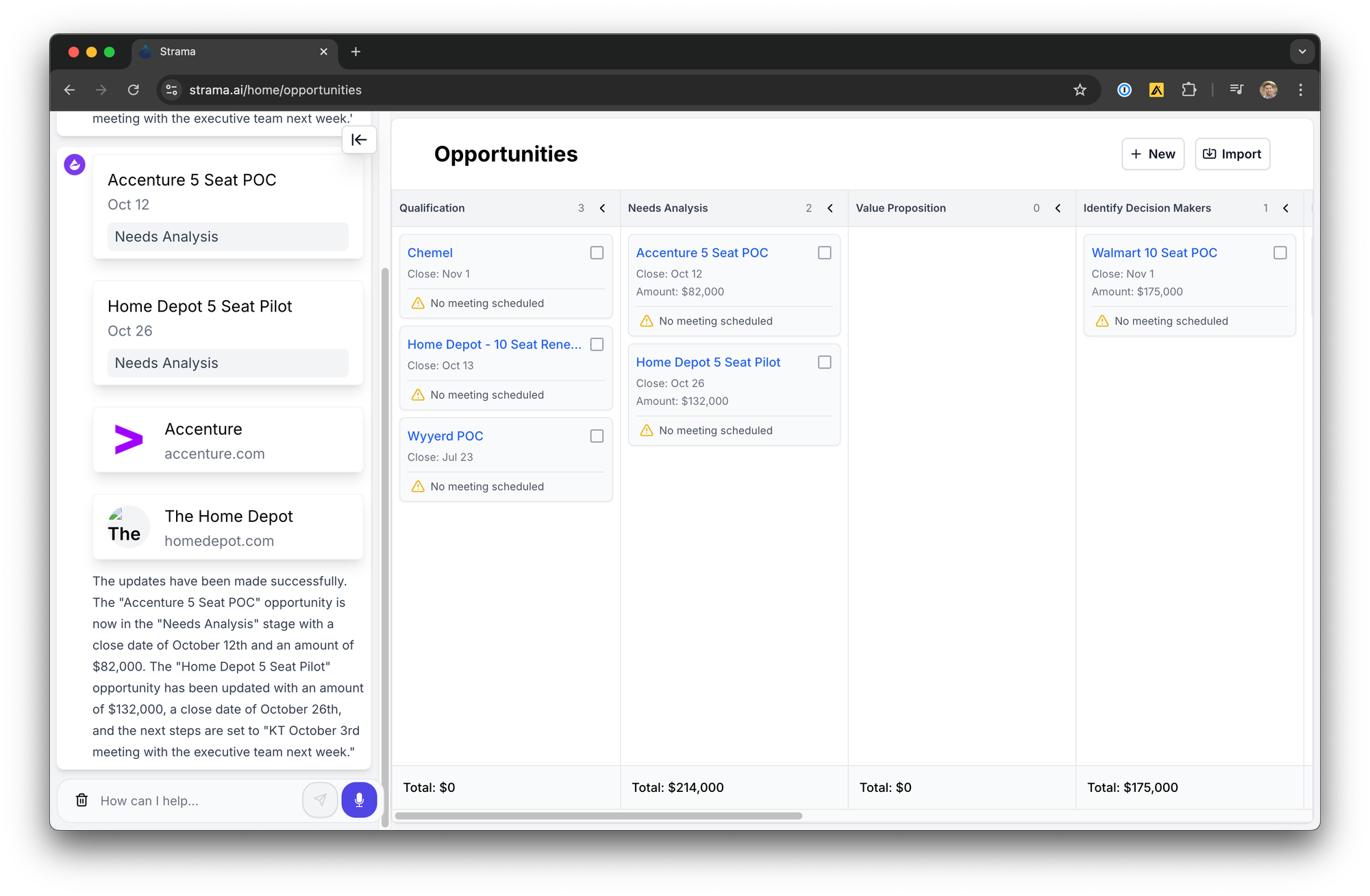 "Hey, I need to make some updates. Move the Accenture 5C POC from qualification to needs analysis. Update that close date to October 12th, and the amount is actually $82,000. For the Home Depot five-seat pilot, that amount is actually $132,000, and the close date is October 26th. Oh, and let's update the next steps to 'KT October 3rd meeting with the executive team next week.'"